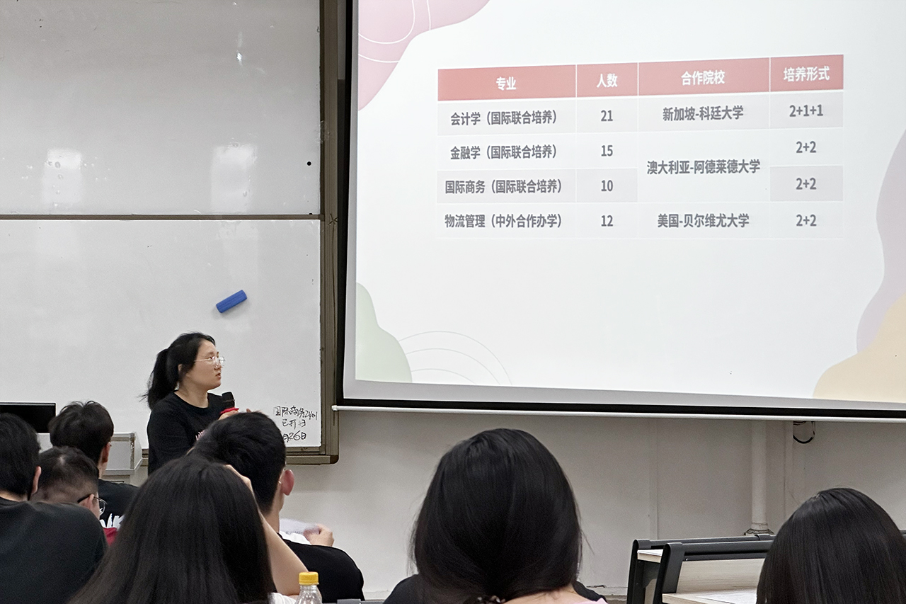 会议伊始,曹磊系统介绍了项目的整体情况。2023级“2+2”项目涵盖国际商务、金融学、会计学三个国际联合培养专业和物流管理一个中外合作办学专业,合作院校来自多个国家。曹磊强调,项目同学要珍惜同窗情谊,在未来的留学生活中互帮互助,共同进步,打造紧密团结的海外学习共同体。