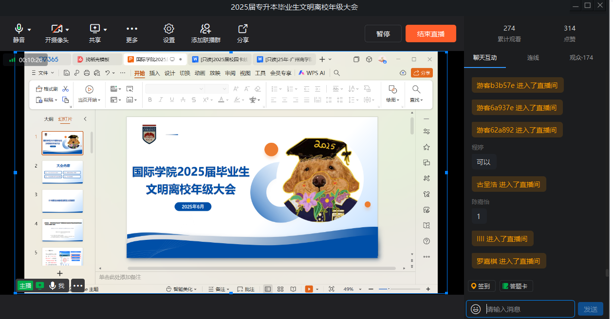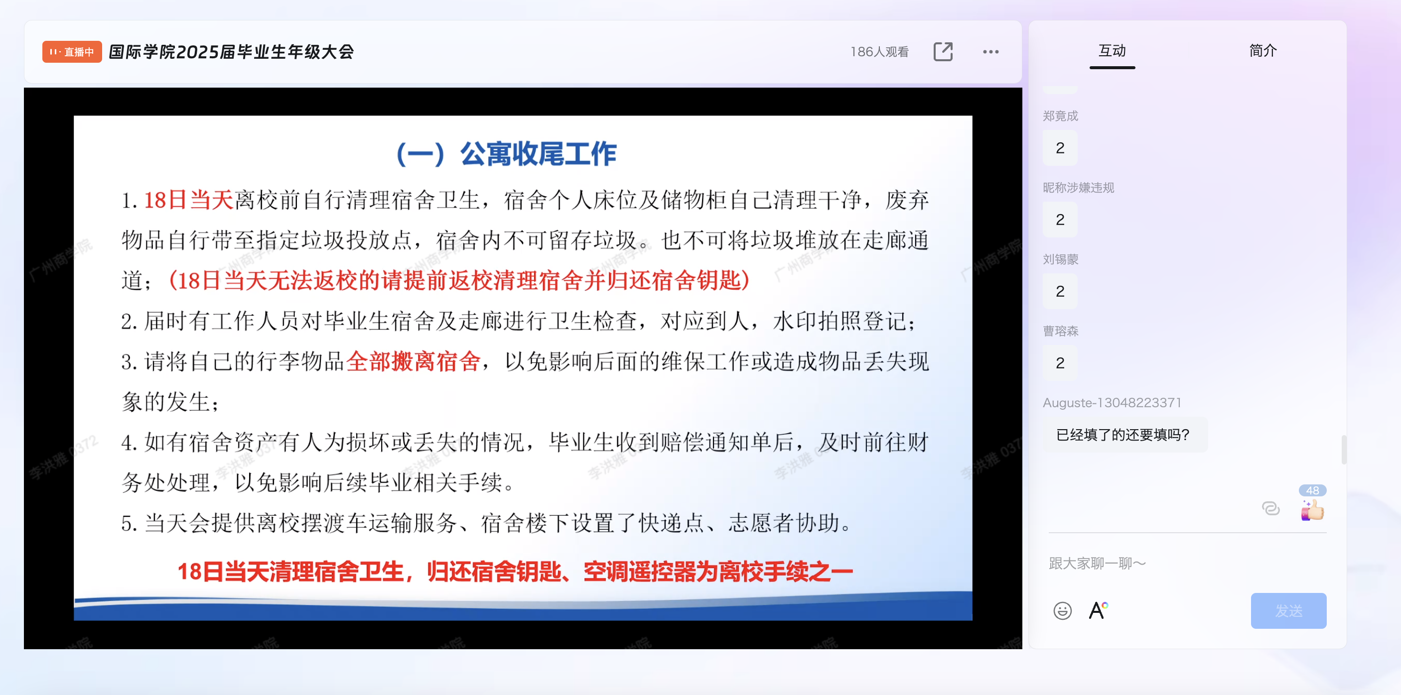 为保障2025届毕业生安全、文明、有序离校,引导他们顺利开启人生新篇章,3044永利于6月5日召开了毕业生年级大会暨安全文明离校线上动员会议。毕业班辅导员陈欣、辜秀敏、张行、鲁兆璐、唐炎桂分别主持所带班级的年级大会。