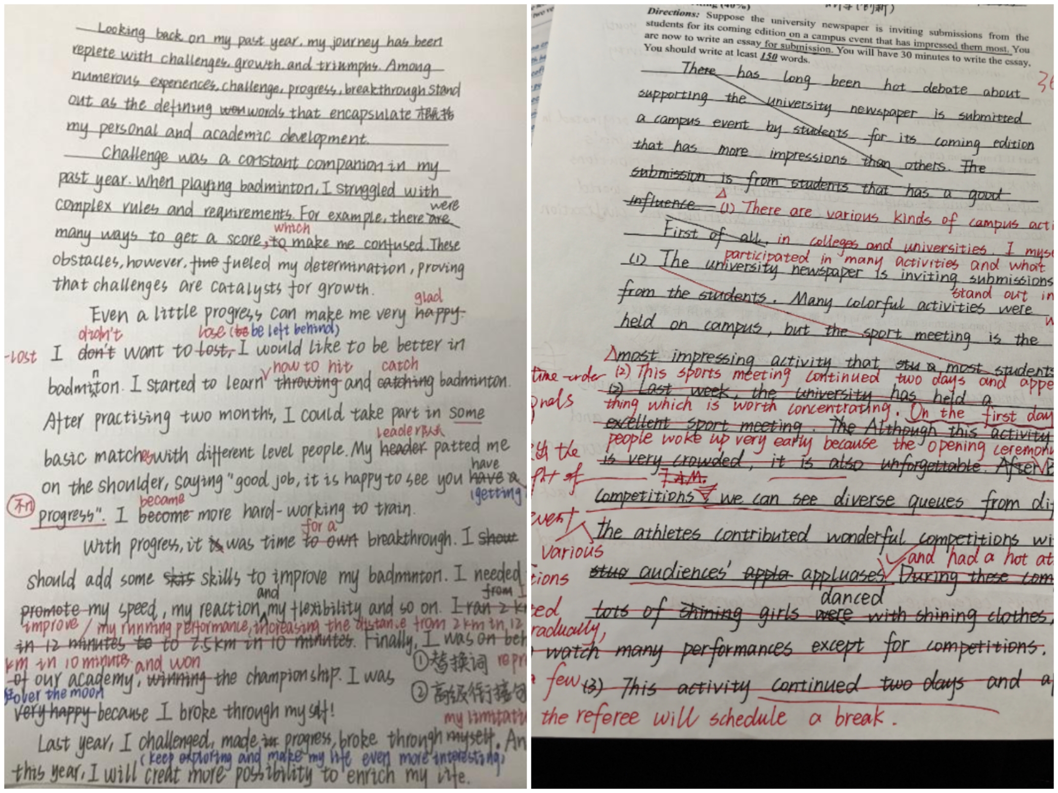 经课程组多次研讨,老师们指出传统英语写作教学中存在教师批改反馈周期长、个性化指导覆盖不足等问题。通过集体备课等教研活动,《英语写作II》课程教师尝试引入豆包写作反馈系统,构建了“学生写作-教师初评-AI深度分析-双向反思”的新型教学闭环。以赖敏洁老师的课程教学为例,教师完成基础性批改后,学生可借助豆包APP的自然语言处理技术对作文进行多维度解析,精准识别语法错误、词汇搭配问题,并分析论证结构的逻辑性。学生对照教师评语与AI的修改建议进行双重反思,自主辨析修改方案的合理性,逐步建立对写作问题的元认知能力,实现从“被动接受修改”到“主动诊断问题”的认知升级。