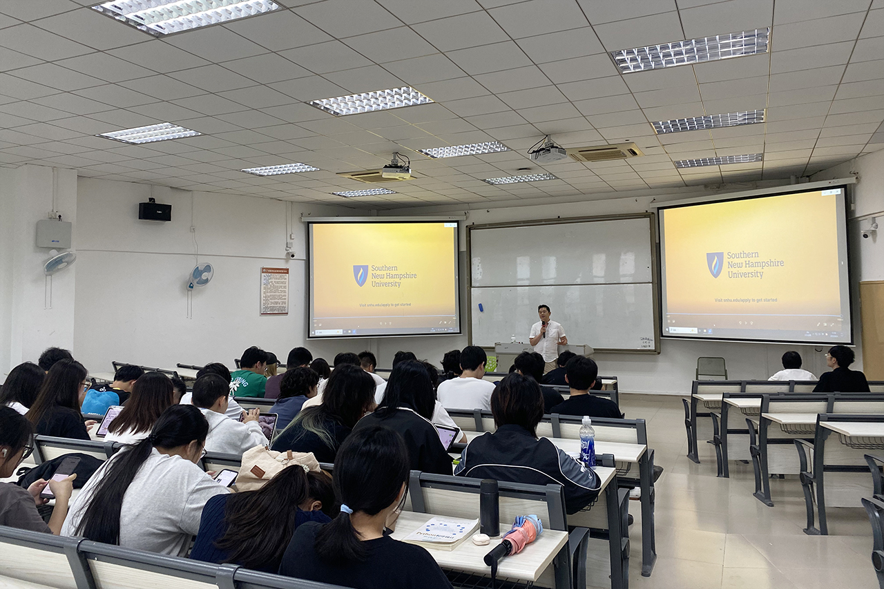 交流会上,刘博教授首先播放了南新罕布什尔大学的精彩宣传视频。视频里,校园风光旖旎,学术活动丰富多元,师生们精神饱满、积极向上,这些画面一一呈现,瞬间吸引了同学们的目光。随后,刘博教授进行了简洁风趣的自我介绍,他那幽默的话语、亲切的态度,迅速拉近了与同学们之间的距离,现场气氛一下子就活跃起来了。