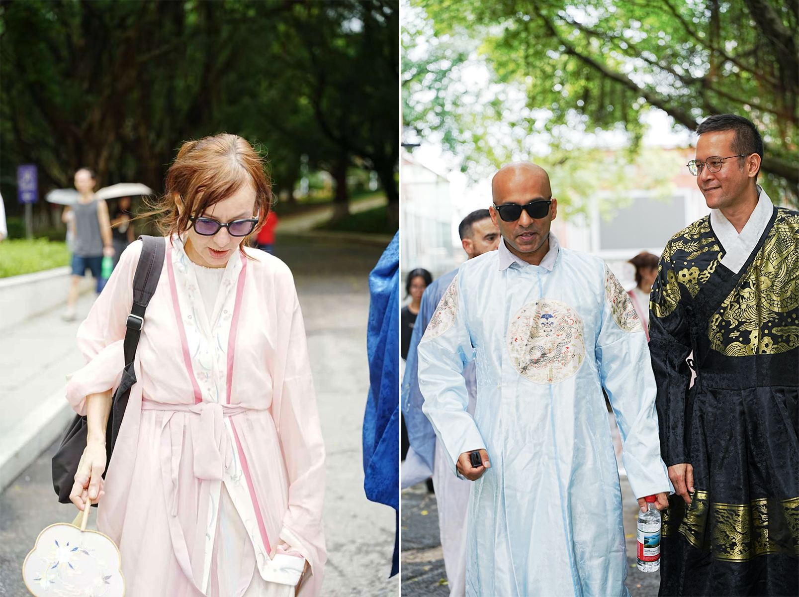 汉服体验环节成为本次活动的亮点。在指引下,外籍教师们纷纷试穿战国袍、唐制、宋制、明制等不同款式的汉服,并学习传统礼仪。黄明珠现场示范讲解了“叉手礼”“拱手礼”等古代传统礼仪手势及其背后蕴含的意义,进一步加深了外籍教师对中华文化的理解。(活动服饰由九歌汉服协会提供)